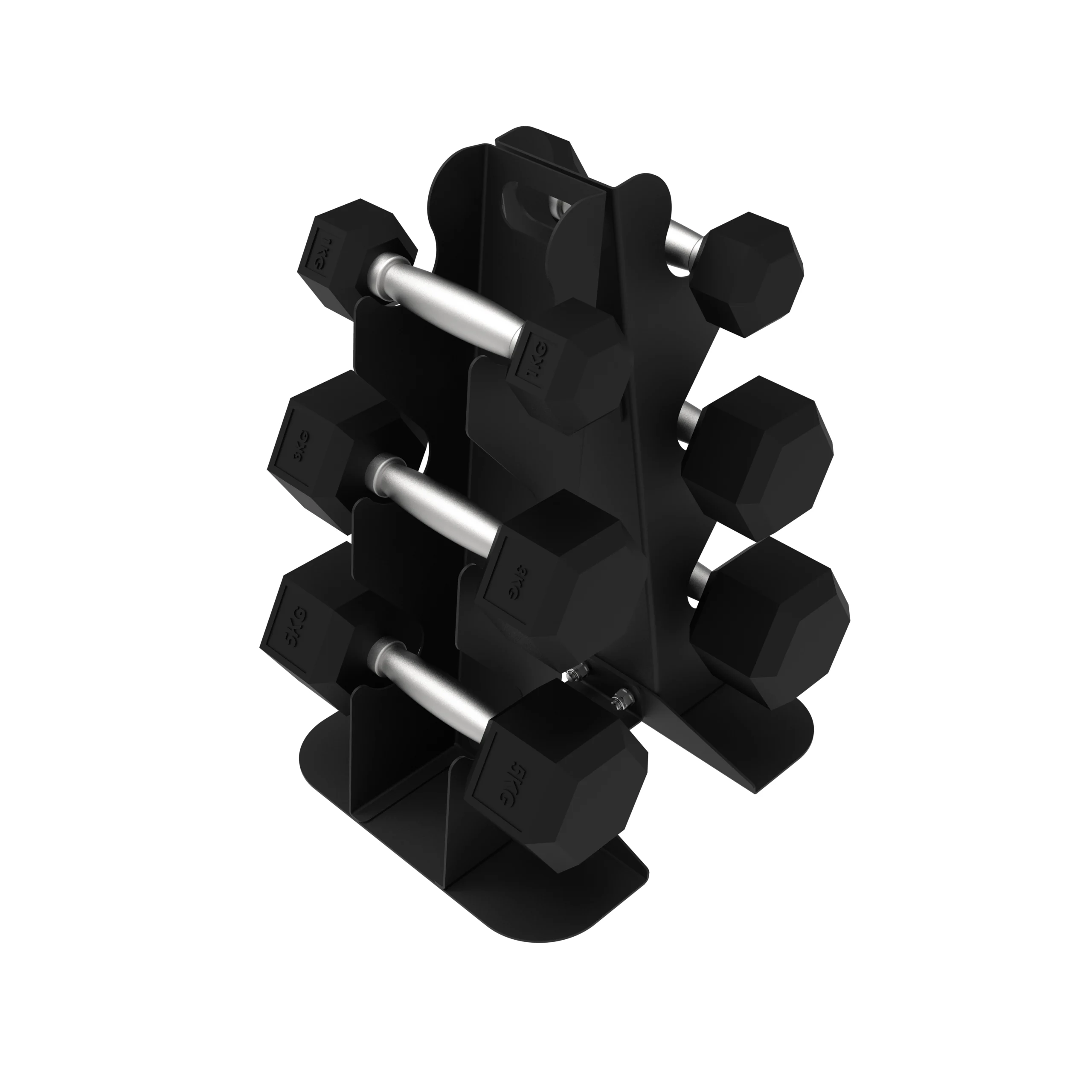 Designed to store Three(3) pairs of dumbbells off the floor and neatly stack them on this rack.