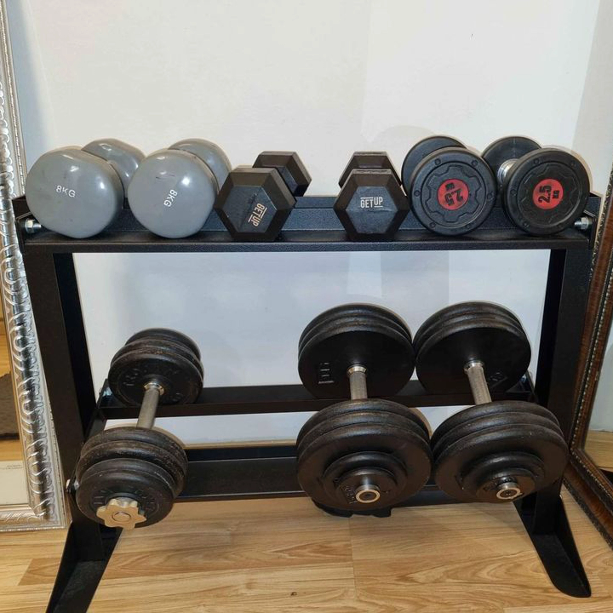 Organize your workout space with this durable 2-tier dumbbell rack. Designed for stability and efficiency, it holds multiple dumbbell pairs, keeping your gym area tidy and accessible.